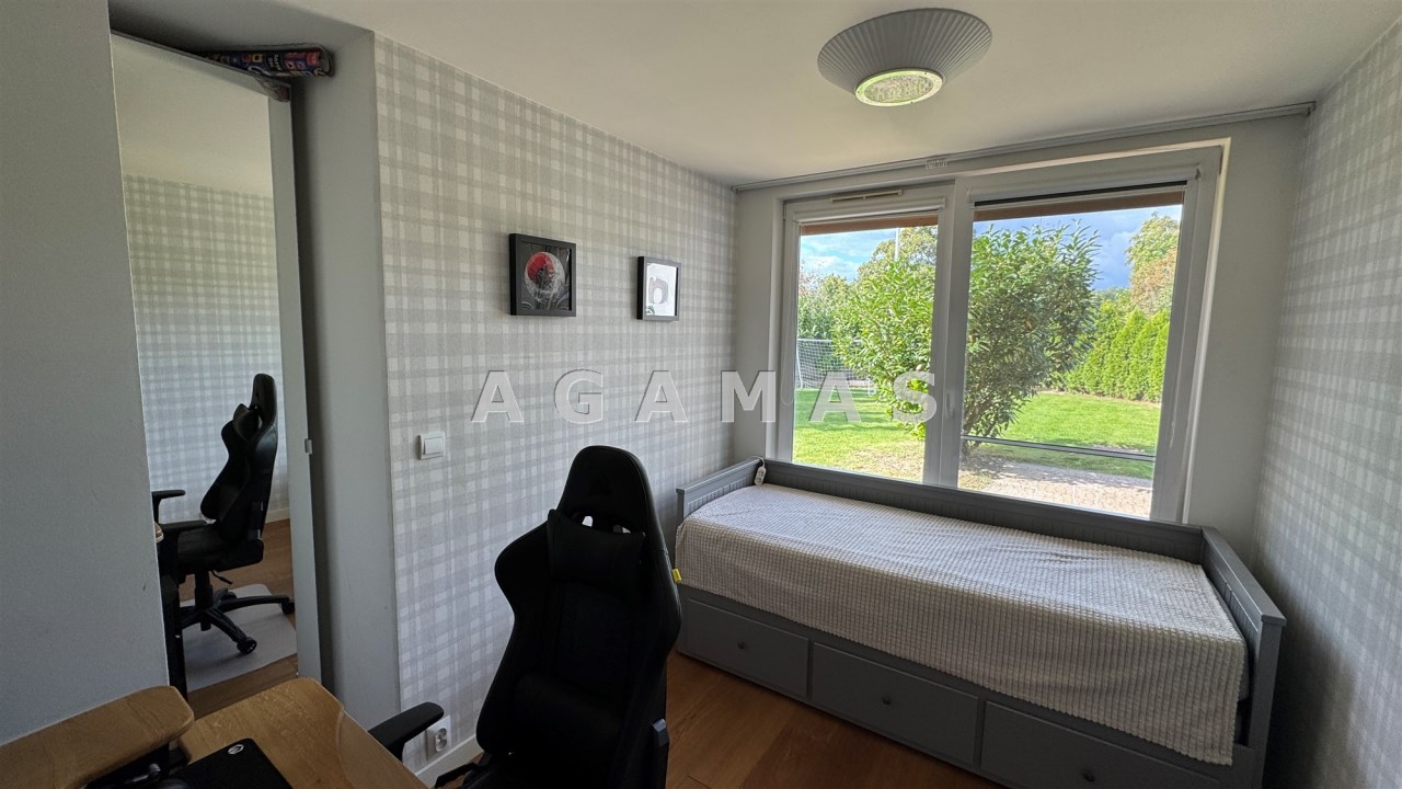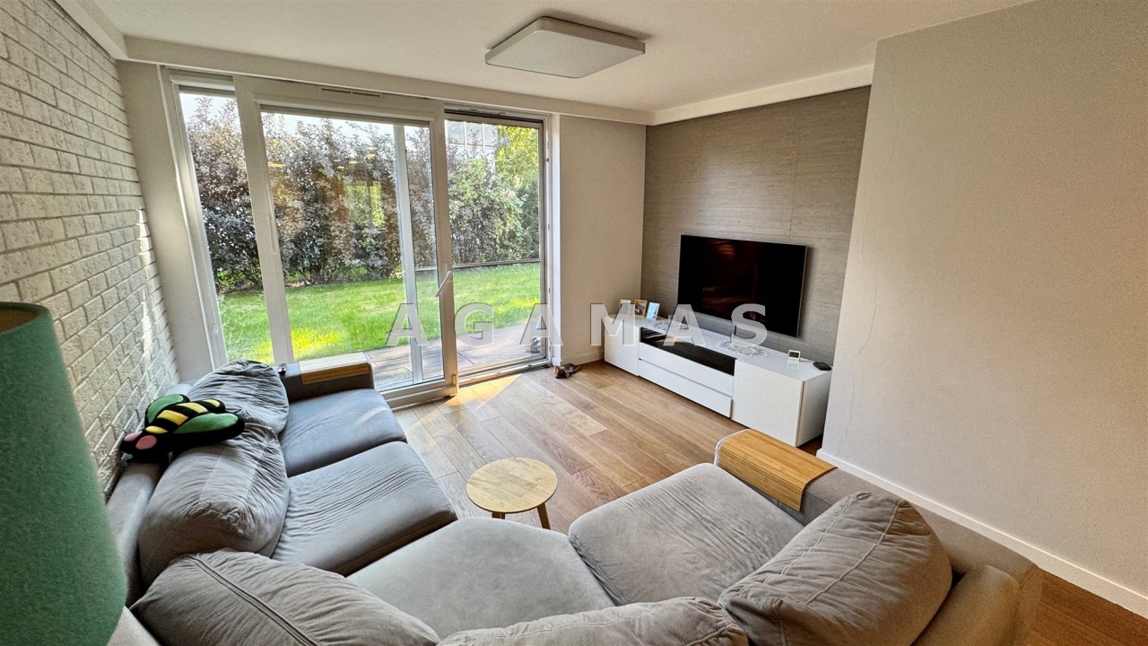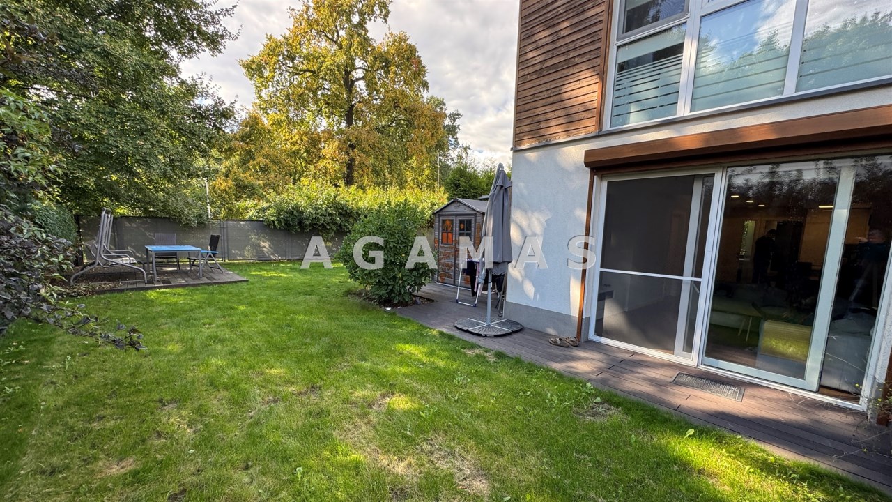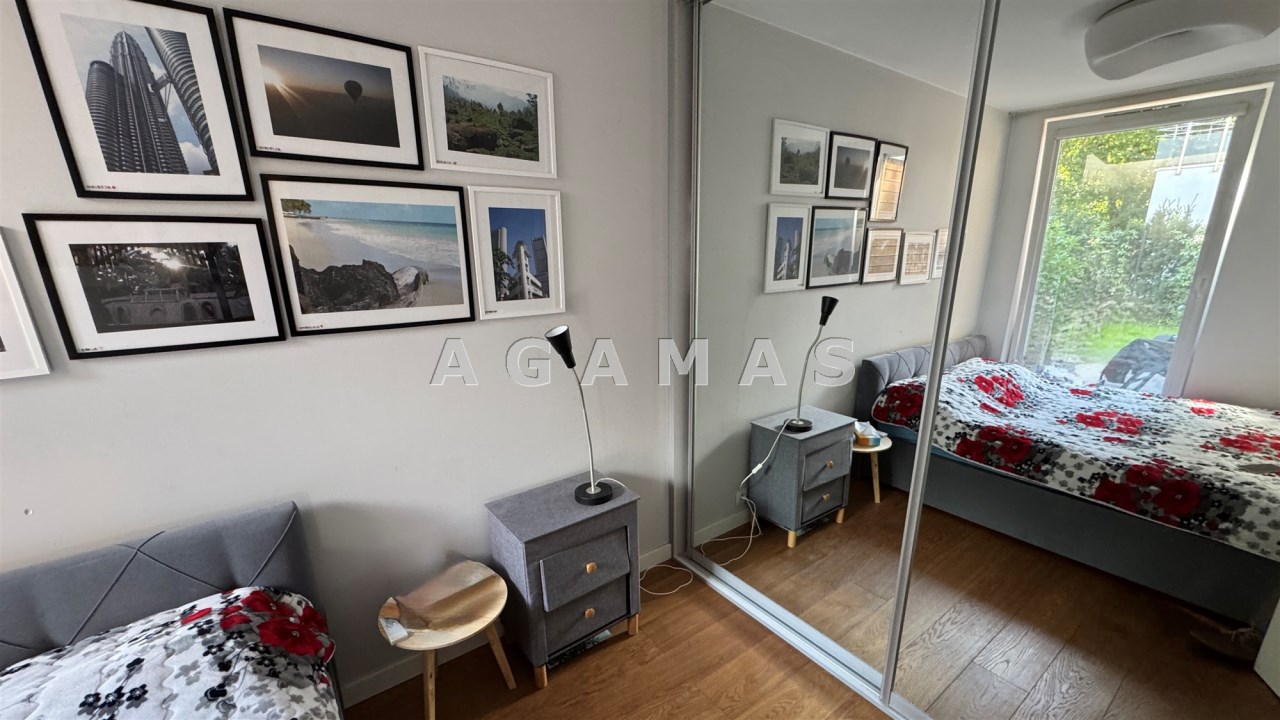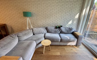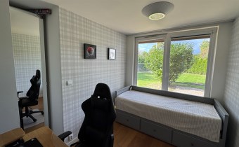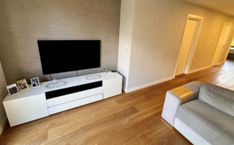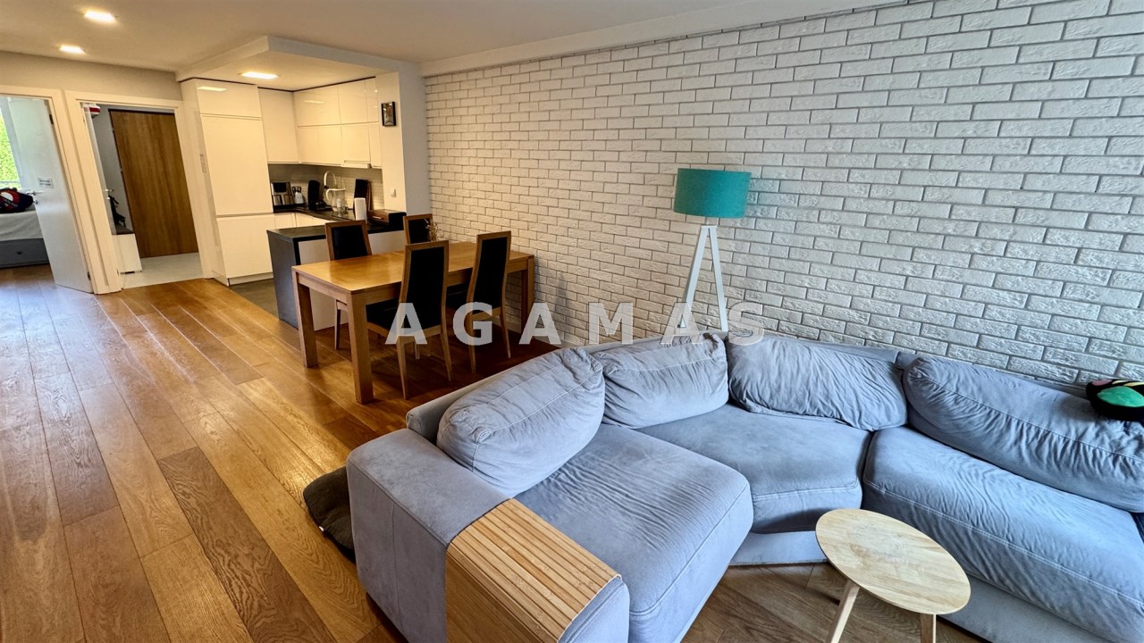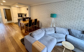 Pokój dzienny przez duże panoramiczne okna połączony z ogrodem z jednej strony. Z drugiej przez wygodną część jadalnianą połączony z częścią kuchenną. Kuchnia z dużą zabudową, robiona przez stolarza. Dwie sypialnie. Podłoga dębowa, szczotkowana, olejowana. Dobrej klasy oświetlenie. Drzwi wewnętrzne dębowe robione na zamówienie. Łazienka z wanną, ale jest też miejsce na prysznic. W całym mieszkaniu ogrzewanie podłogowe. W oknach rolety antywłamaniowe. W podziemiu dwa miejsca postojowe z możliwością zamknięcia do samodzielnego podwójnego boksu (dodatkowo płatne). Zejście do garażu obok mieszkania.