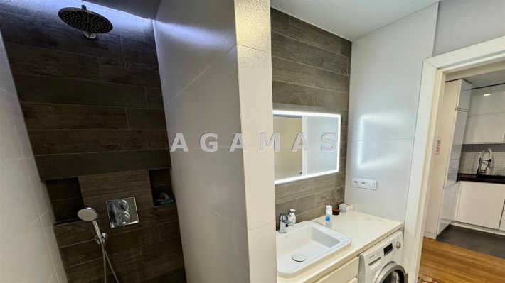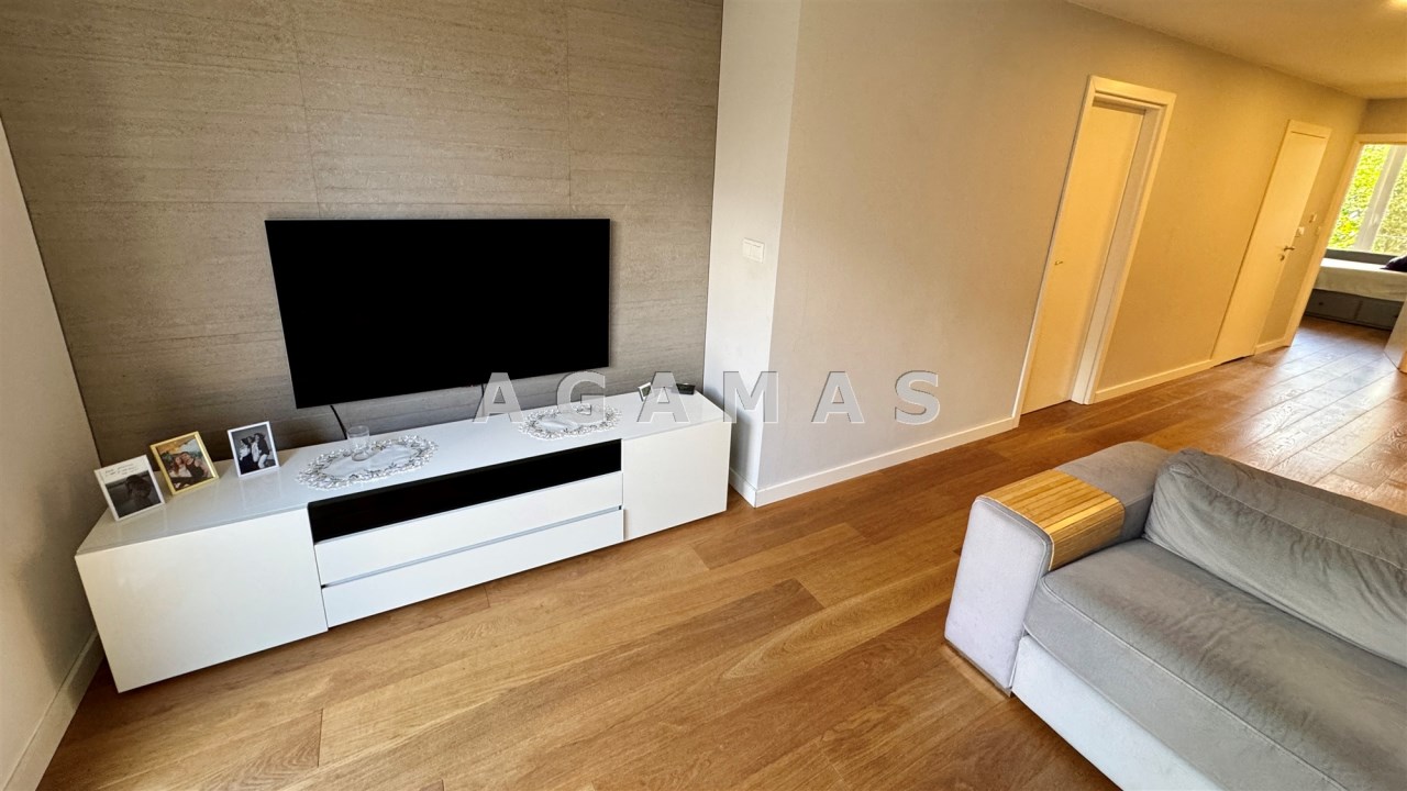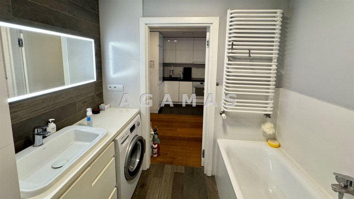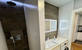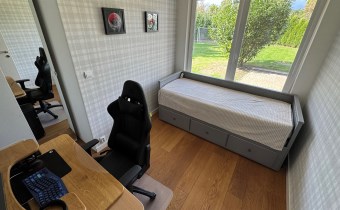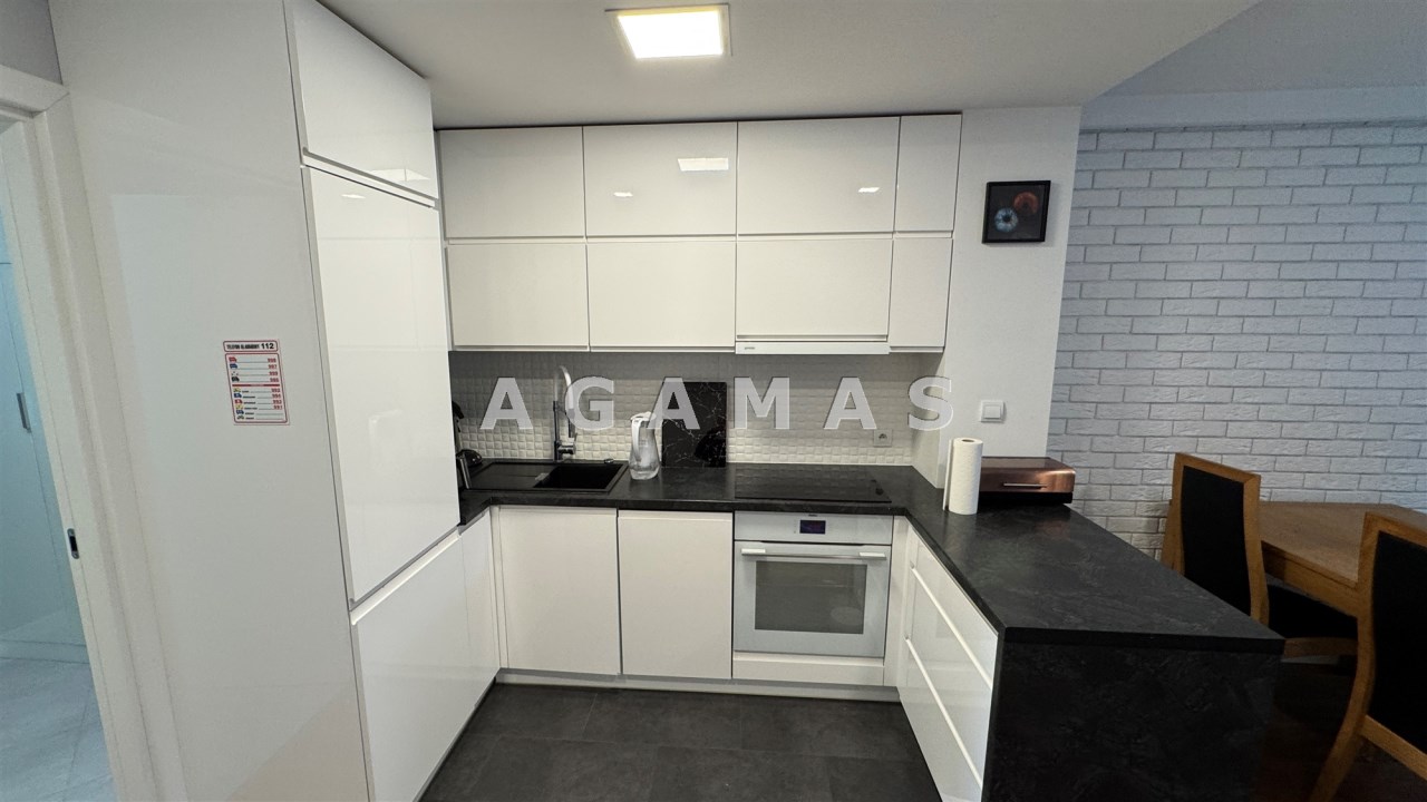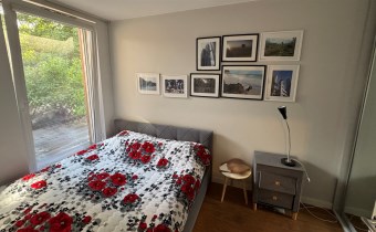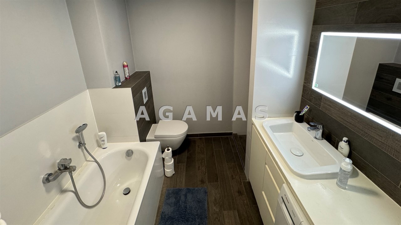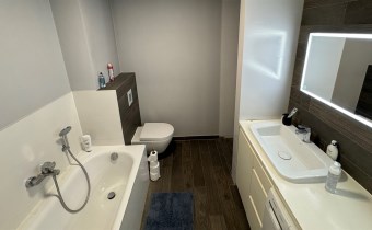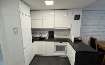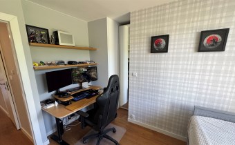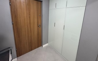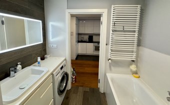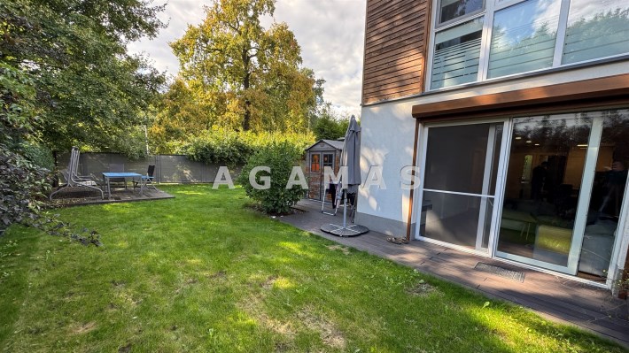 Pokój dzienny przez duże panoramiczne okna połączony z ogrodem z jednej strony. Z drugiej przez wygodną część jadalnianą połączony z częścią kuchenną. Kuchnia z dużą zabudową, robiona przez stolarza. Dwie sypialnie. Podłoga dębowa, szczotkowana, olejowana. Dobrej klasy oświetlenie. Drzwi wewnętrzne dębowe robione na zamówienie. Łazienka z wanną, ale jest też miejsce na prysznic. W całym mieszkaniu ogrzewanie podłogowe. W oknach rolety antywłamaniowe. W podziemiu dwa miejsca postojowe z możliwością zamknięcia do samodzielnego podwójnego boksu (dodatkowo płatne). Zejście do garażu obok mieszkania.