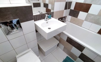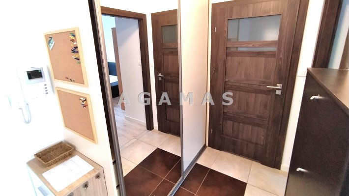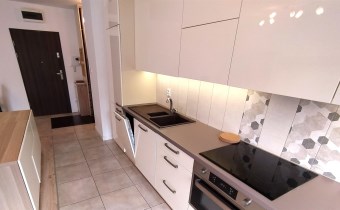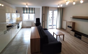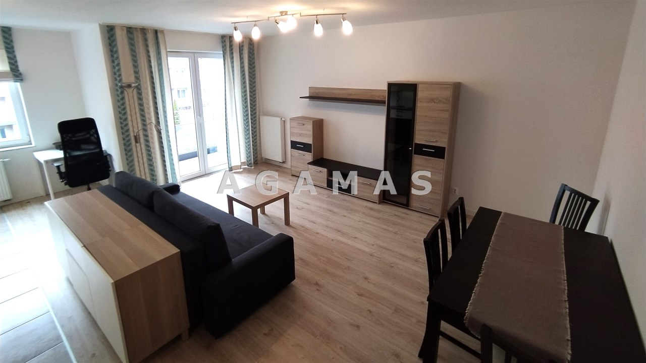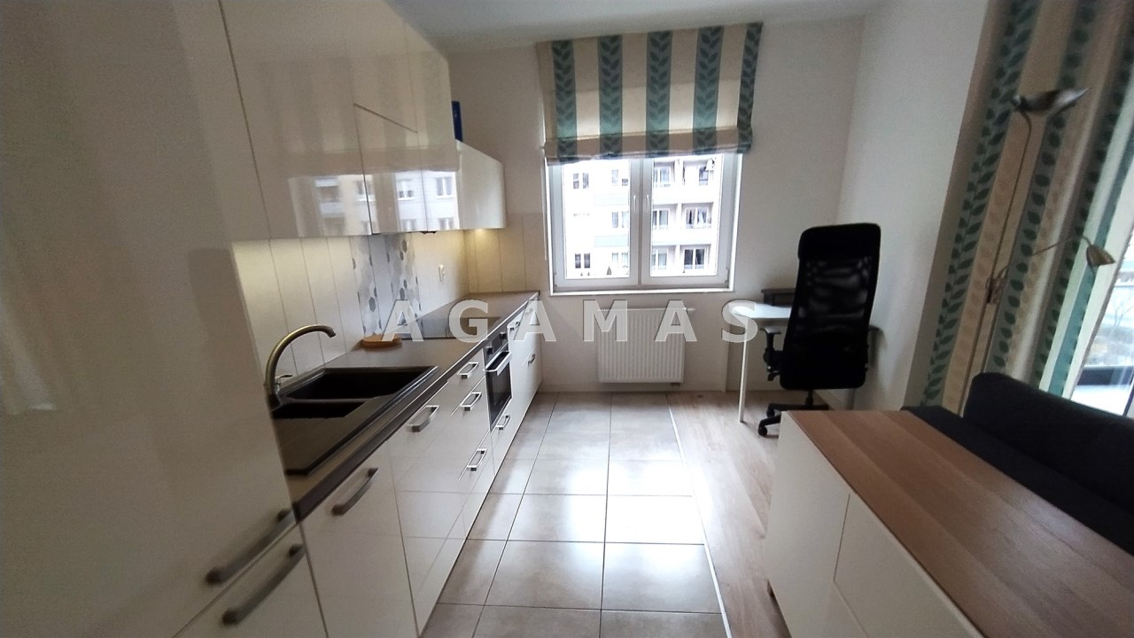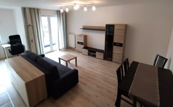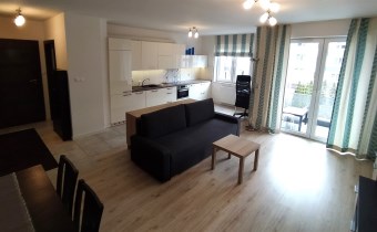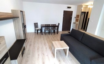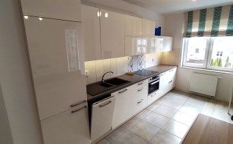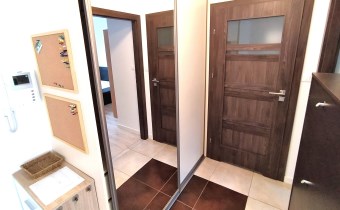Mieszkanie 2-u pokojowe o pow. ok. 51 mkw., zlokalizowane na drugim piętrze (winda). Bardzo przestrzenny pokój dzienny połączony z kuchnią. Umeblowany. Obszerny balkon z widokiem na wewnętrzny, zielony dziedziniec. Część kuchenna z dużą zabudową ze sprzętem AGD (płyta indukcyjna, piekarnik, zmywarka, wysoka lodówka z zamrażarką) i podstawowym wyposażeniem. W przedpokoju szafa lustrzana w zabudowie i osobna szafka na buty. Sypialnia z łóżkiem (wygodny materac), szafa. Łazienka z wanną, pralka i liczne szafki. Do mieszkania przynależy bezpieczna piwnica. Pod budynkiem miejsce postojowe w garażu wielostanowiskowym (obowiązkowe dodatkowo 250 zł).